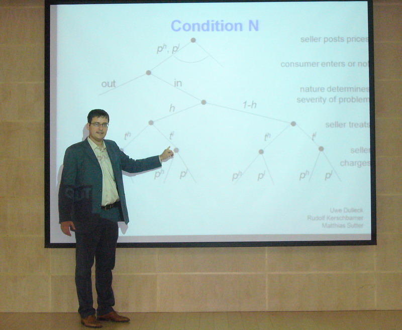 2009年5月22日上午,澳大利亚昆士兰科技大学Uwe dulleck教授应邀来到Bet365(亚洲)中文官方网站 学术报告厅为Bet365(亚洲)中文官方网站 师生做了一场主题为“On the Role of Verifiability on (Experimental) Market for Credence Goods”的学术报告会。Bet365(亚洲)中文官方网站 院长徐康宁教授主持了此次学术报告会,院党委耿有权副书记,任凤慧老师、王铮老师及Bet365(亚洲)中文官方网站 近50名研究生和留学生同学等参加了此次报告会。