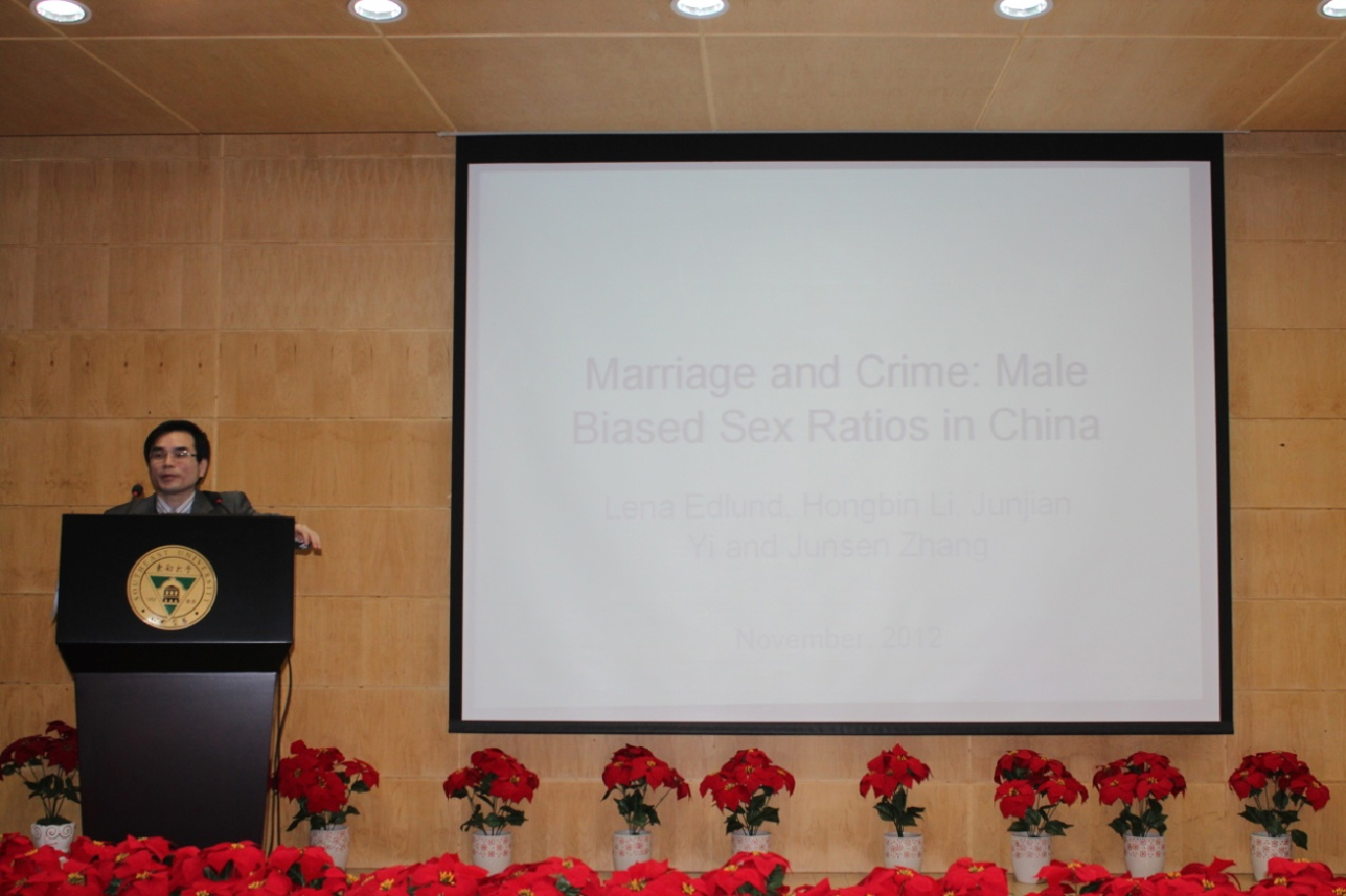 刘波书记代表东南大学致辞,介绍了张俊森教授的主要成就并为张教授颁发聘书、佩戴校徽,现场气氛热烈。受聘仪式结束后,张教授做了题为“Marriage and Crime: Male Biased Sex Ratios in China”的学术报告。张教授将现实观察与经济理论相结合,用严谨的经济学方法探讨中国男性比例偏高对婚姻市场与犯罪行为的影响,得出了很多有趣的结果。张教授先从上世纪50年代以来中国男性比例不断攀升的事实出发,解释可能导致这一现象的原因。然后提出理论模型与假设,并用中国数据进行检验。结果发现,16-25岁的人口中,男性比例偏高,会导致犯罪率的攀升;在婚姻市场中,男性单身的概率更高,在已婚男性中,他们的配偶会更年轻且收入更低;在家庭内部,男性可能会从事更多的家务,女性则可能拥有更多的决策权;在劳动力市场上,男性可能会接受更多的教育,同时更可能失业,不过一旦就业则能获得更高的工资。张教授热情洋溢、生动诙谐的演讲吸引了在场所有的师生。本次受聘仪式暨学术报告会在一片热烈的讨论中圆满结束。