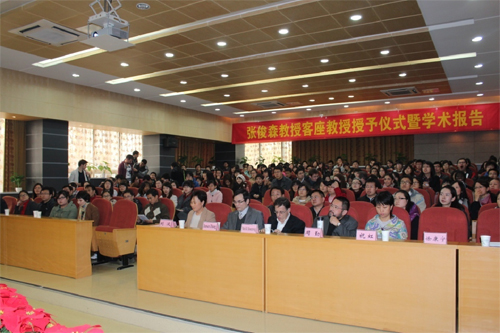 2012年11月20日下午,香港中文大学张俊森教授受聘我校客座教授仪式暨学术报告会在Bet365(亚洲)中文官方网站 报告厅隆重举行。徐康宁院长主持仪式。校党委副书记兼副校长刘波教授、社会科学处邱斌处长、周勤副院长、祝虹副书记兼副院长、著名经济学家美国耶鲁大学Rosenzweig教授等出席了受聘仪式。