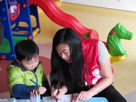 当志愿者刚刚打开活动室的门的时候就有家长带小孩子进来玩,不知不觉地,活动室的孩子也逐渐多了起来。开始时大多是家长利用志愿者提供的器械来跟孩子玩,很快志愿者们也用他们的热情参与到活动中来,开始于儿童交谈,哄他们开心。活动室内渐渐充满了笑声。