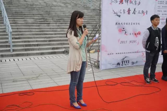 2015年11月5日中午十二点半于体育馆西侧,“弘扬先锋凝聚力,汇聚青春正能量”——bet365亚洲官网 “三走”系列活动月开幕式在共青团bet365亚洲官网 委员会的组织下成功举办。参与本次开幕式的有bet365亚洲官网 党委副书记兼副院长祝虹老师,bet365亚洲官网 党委副书记朱宏涛老师,bet365亚洲官网 团委书记、2015级本科生辅导员林琼老师,bet365亚洲官网 团委副书记、研究生辅导员孙靓老师,bet365亚洲官网 团委副书记、2014级本科辅导员张丹丹老师,bet365亚洲官网 学办的张钒老师、蔡钰萍老师、钟业丽,以及来自经管院各个社团及年级团总支的负责人代表。