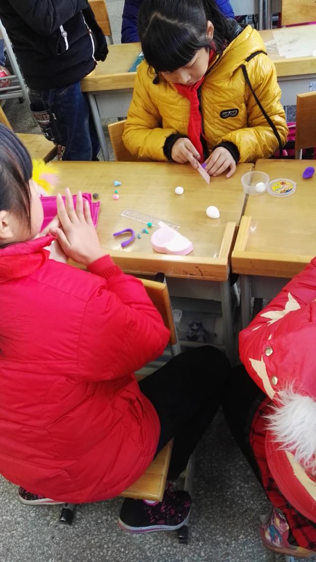 当志愿者们来到五年级(1)和(2)班时,班内的同学们激动不已,纷纷表示欢迎。随后,志愿者们按照分配有序的进入班级。在与老师进行简单的交流后,志愿者们按照老师的建议对同学分组,并把带来的手工课道具分给同学,开始教课。志愿者们与同学们玩在一起,学在一起,笑在一起,同时也一起感受着支教与被教的乐趣。志愿者们不停地与同学进行互动,为同学们进行示范,指导同学们完成一个又一个作品。这其中,当同学们发生小摩擦时,志愿者们也用耐心和笑容缓解小朋友之间的不愉快。