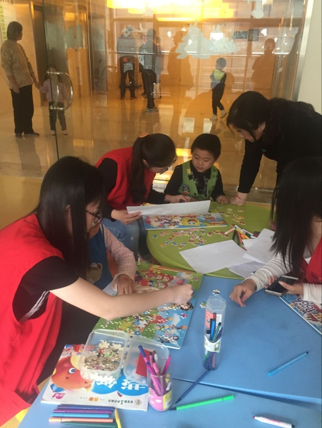 欢乐的时间总是显得很短暂,在一片愉悦的氛围中时间就到了四点半,小朋友们陆续被家长带回去吃饭或者休息。志愿者们一直等到最后一个小女孩拼完最后一片拼图离开之后才收拾东西,并在离开之前合了影,为这次特别的关爱活动留下纪念。