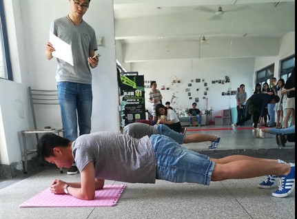 相对于男子组,女子组比赛氛围轻松多,大家相互鼓励。有位正在进行平板支撑同学满脸通红的吼道:“为了奶昔,为了周黑鸭,拼了”,大家听到后立刻笑了,顿时打破了紧张的比赛气氛。在这一环节中,不仅有欢声笑语,而且有坚持和汗水!