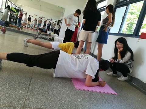 相对于男子组,女子组比赛氛围轻松多,大家相互鼓励。有位正在进行平板支撑同学满脸通红的吼道:“为了奶昔,为了周黑鸭,拼了”,大家听到后立刻笑了,顿时打破了紧张的比赛气氛。在这一环节中,不仅有欢声笑语,而且有坚持和汗水!