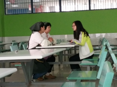 422日下午,志愿者在食堂询问后勤阿姨们想要了解的金融知识以及相关的问题。根据搜集的问题,志愿者们整理资料制作讲解的材料。
