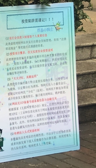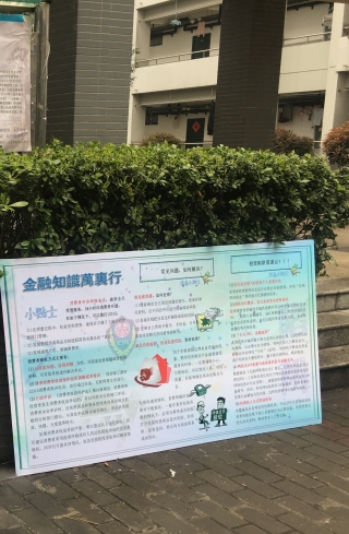 前两项活动结束后,志愿者们立即整理相关活动资料和图片,制作展板,为最后一个针对大学生的金融知识普及环节做准备。2017516日,志愿者们将制作好的展板摆放于宿舍内大道两旁,学生们每天都能路过并关注其内容。