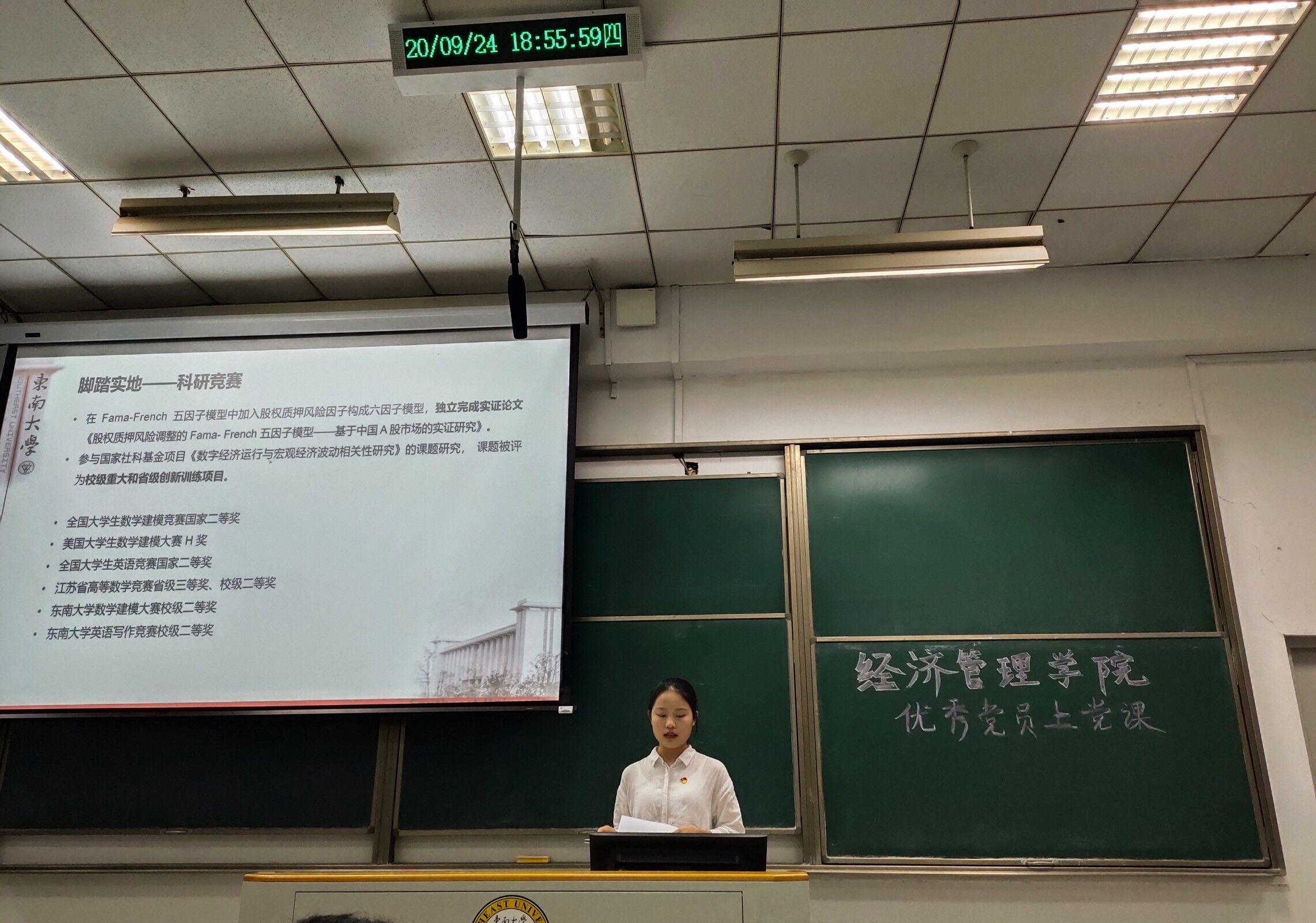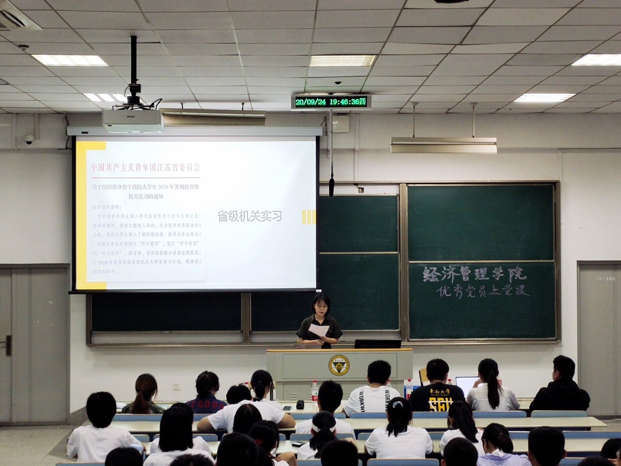 秋高气爽,蝉鸣蛙叫,伴随着“秋天第一杯奶茶”的梗,新生们的军训之旅也渐近尾声。2020年9月24日晚,在暖场视频《初心》播放结束后,“bet365亚洲官网 优秀学生党员为2020级新生上党团课”活动在美丽的九龙湖畔教四-304教室里隆重举行。
