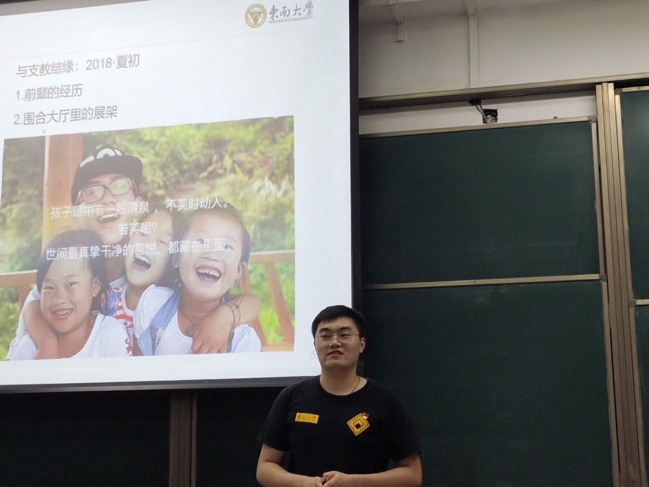 武天驰同志分享了在自我追求的过程中逐渐谦虚内敛、提高思想认识的故事。他在探索自我、了解自我的期间与支教结缘,成为支教协会至善黔程高武分队的一员。在高武支教期间,他强烈地感受到高武地区贫穷落后的背面是孩子们对知识和更大世界的渴望,他清楚地认识到连续、高效的教育对于贫困村落的重要性。正是这种经历进一步坚定了他入党的初心,使得他决意肩负起东大学子身上的担当,为社会和人民的需求努力奋斗。