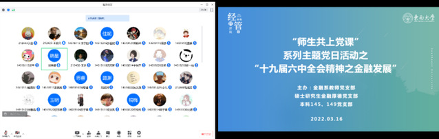 党的十九届六中全会是在党百年华诞的重要时刻,“两个一百年”奋斗目标历史交汇关键节点上召开的一次重要会议。为了让支部同学更深入地学习和领会党的十九届六中全会精神,并结合自身专业知识学以致用, 2022年3月16日中午,bet365亚洲官网 金融系教师党支部、硕士研究生金融厚德党支部、本科145和本科149党支部共同举办了“师生共上党课”系列主题党日活动第二场——“党的十九届六中全会精神之金融发展”。