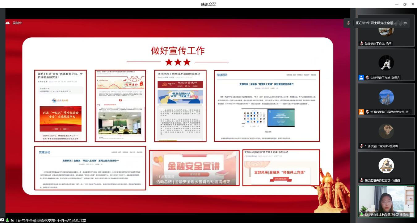 本科生145党支部书记刘知源围绕“规范支部建设 夯实支部根基”“重视党员教育 筑强支部灵魂”“夯实战斗堡垒 扩大支部影响”三个部分展开述职。支部扎实组织理论学习,发挥党员先锋模范作用。开展金融安全进校园、金融安全进社区、金融安全进家乡的“三进”活动,以“东南学工家”和“先锋工作站”为宣传阵地,传播支部好声音、好行动。
