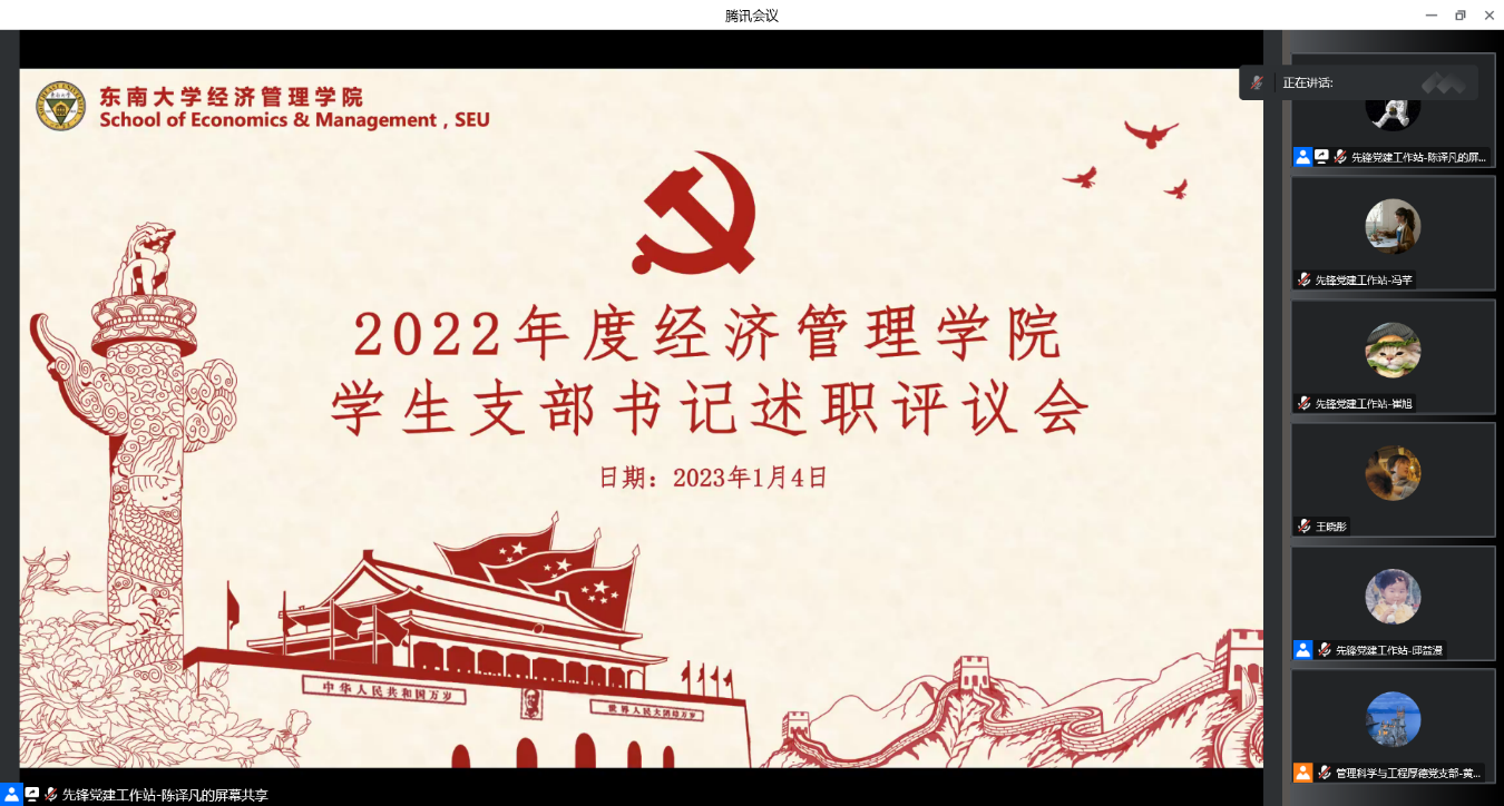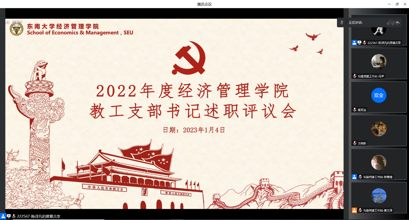 1月4日,bet365亚洲官网 2022年度全院支部书记述职会议在腾讯会议线上顺利召开。学院党委书记袁健红老师、党委副书记兼副院长何熠老师、全体教工、学生支部书记以及辅导员代表等出席。会议由先锋党建工作站陈译凡同学主持。