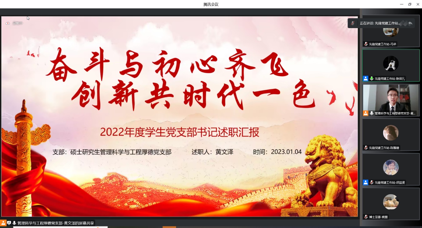 硕士研究生管理科学与工程厚德党支部书记黄文泽从党日活动创新发展、理论学习走心走实、制度建设科学系统、干事创业敢想敢为、品牌塑造匠心凝聚五个方面介绍了支部年度工作。支部通过党课宣讲、学术提升、工作交流、就业分享、红色实践、读诗感悟等模块,创新党日活动形式,让磨炼成为青年最好的成长礼,让实践成为青年最好的墩苗田。支部打牢思想基础,在理论学习上下功夫,在建章立制中促规范,围绕“创新、融合、发展”理念,扎实开展品牌塑造和形象宣传,扩大党建影响力,用实干笃行向学院交出属于管科的完美答卷。