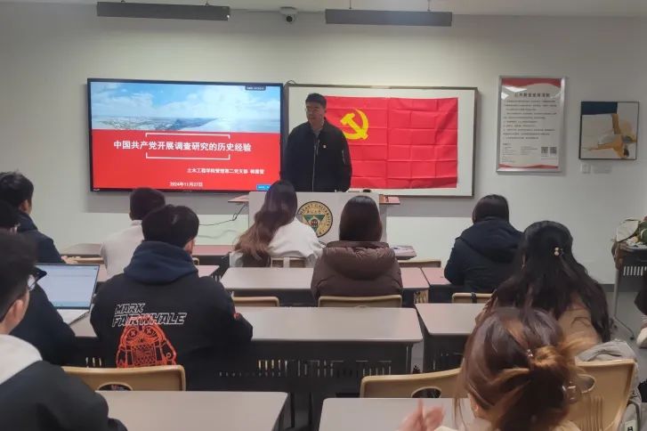 在理论学习环节,两支部党员共同学习了习近平新时代中国特色社会主义思想的重要论述。土木工程学院管理第二党支部书记韩露萱以《中国共产党调查研究的历史经验》为主题,结合《关于在全党大兴调查研究的工作方案》,为两个支部的党员讲解了调查研究的内涵与重要意义、调查研究中应注意的问题及相关制度。bet365亚洲官网 硕士研究生管理科学与工程厚德党支部纪检委员梅紫晨、副书记郝韵则通过《而今迈步从头越 —— 纪念红军长征出发90周年》专题党课,从习近平总书记关于长征精神的重要论述、长征精神的科学内涵和实践价值和以长征精神领航走好新的赶考之路三个方面对长征精神内涵进行了深刻的解读。