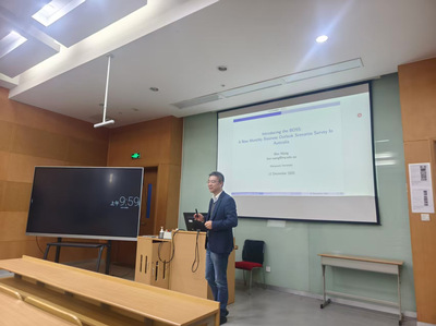 王教授带来题为《商业前景不确定性调查》的专题学术报告,围绕商业预期与不确定性的测度问题展开。BenWang指出,商业预期及不确定性对企业投资、就业与创新决策具有关键影响,是宏观经济政策制定的重要依据。然而,尽管商业调查数据在政策讨论中作用显著,许多国家仍面临此类高质量数据的稀缺问题。为填补这一空白,其研究团队通过每月对500家澳大利亚企业进行持续性调查,构建了一个独特且高频的商业前景不确定性数据集。该数据集不仅系统捕捉了企业层面的预期波动与不确定性感知,还为基于自然实验的因果推断提供了宝贵素材,有望显著推动相关学术研究并支撑实证导向的政策分析。