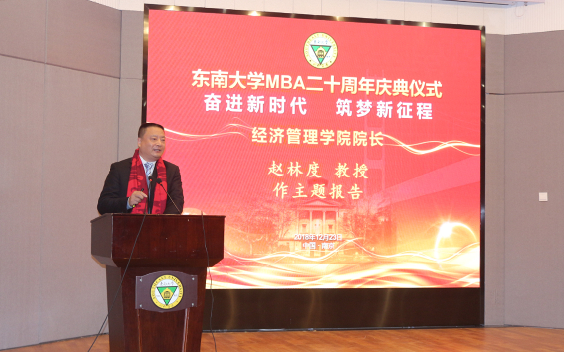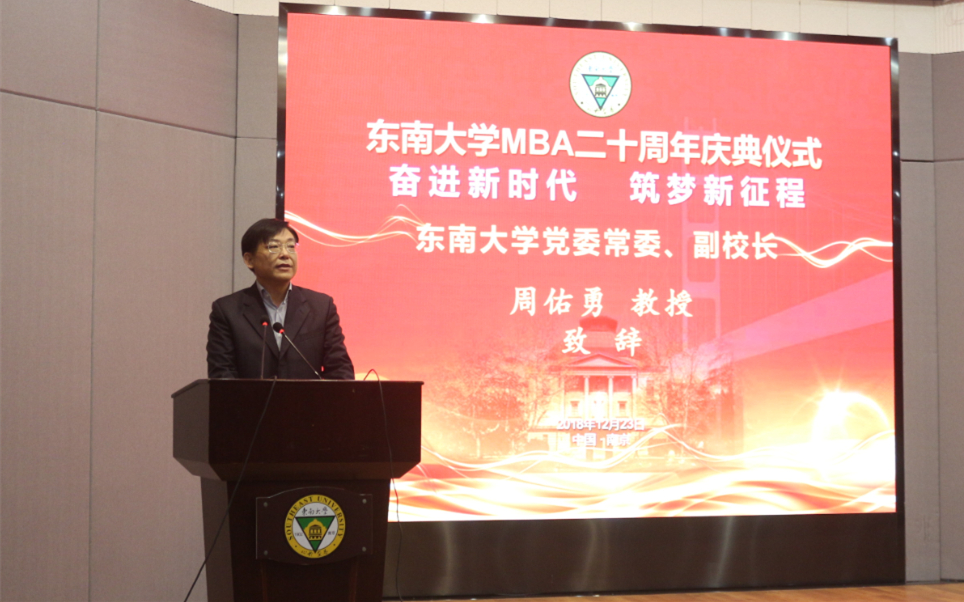 12月23日上午,东南大学MBA办学20周年庆典大会在四牌楼校区逸夫科技馆报告厅隆重举行。东南大学党委常委、副校长周佑勇教授,全国MBA教育指导委员会秘书处王萍主任,全国MBA教育指导委员会委员、东南大学首席教授徐康宁教授,深圳航空江苏分公司党委袁咪咪书记,深航商旅马波副总经理,中冶华天李惠莹总经理,以及院领导赵林度、祝虹等,与MBA师生一起300多人齐聚一堂,共同庆祝东南大学MBA20周年华诞。