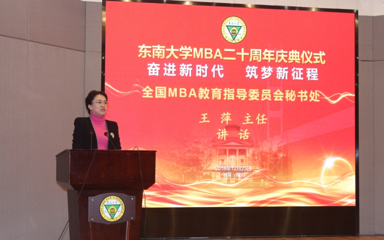 王萍主任在讲话中指出,MBA教育已经成为国培养高层次应用型管理人才的重要渠道,对我国的改革开放和经济社会发展做出了重要贡献。王主任高度评价了我校MBA教育工作,她认为,东南大学MBA教育已形成了较大的办学规模,建设了一支优质的教师队伍,构建了职业化的项目管理体系,完善和创新了科学的MBA培养模式,培养了一大批具有现代管理思想、创新创业精神、优良社会责任感和职业道德的商业精英。王主任勉励MBA学子们:勤于思考,勇于创新,敢于突破,追求卓越,铸造现代工商企业领导者品格。她寄语MBA学子们: 放大胸怀,磨练意志,提升格局,敢于担当,着眼未来。