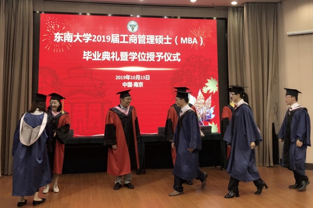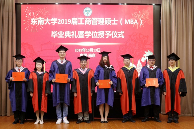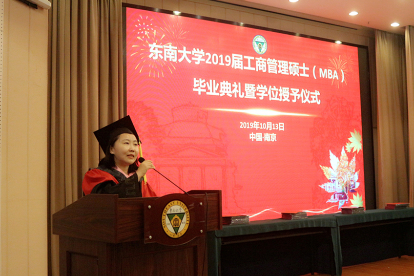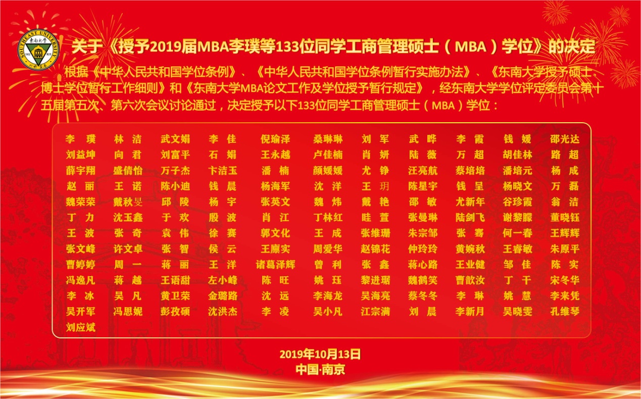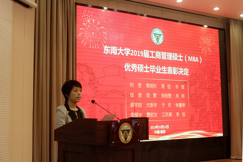 吴在军主任宣读了关于《授予2019届MBA李璞等133位同学工商管理硕士(MBA)学位》的决定;祝虹副书记宣读了《向君等16位MBA同学荣获东南大学2019届优秀硕士毕业生》的表彰决定。