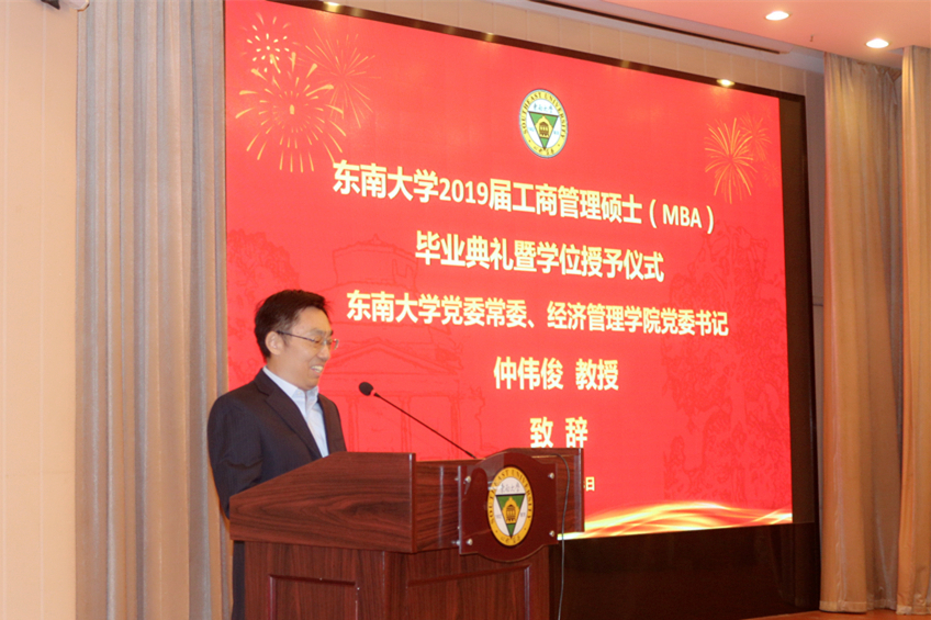 仲伟俊书记发表了热情洋溢的致辞。他首先代表学院全体教职工,向133位荣获工商管理硕士(MBA)学位的同学们表示热烈的祝贺,向默默耕耘的老师们和大力支持的亲属们表示衷心的感谢!仲书记说,2019年是新中国成立70周年,同学们在这么一个年份毕业,预示着你们的30周年毕业庆将与新中国的百年华诞同庆,这是多么有意义的幸运。他说,三年前你们带着憧憬跨入校门,三年的求学生涯,让你们在东南大学这个大家庭里收获了成长,今天,你们带着MBA毕业生的新身份和工商管理领域的新知识迈出校门,希望大家始终如一地坚守内心的价值标准,树立有情怀的追求,保持强烈的责任感,摒弃短期的功利,投身更广阔的事业。仲书记真诚地勉励同学们:要将个人的发展融入人类的文明进步和中华民族的伟大复兴之中,让生命不断焕发光彩,无愧于时代,无愧于人生!