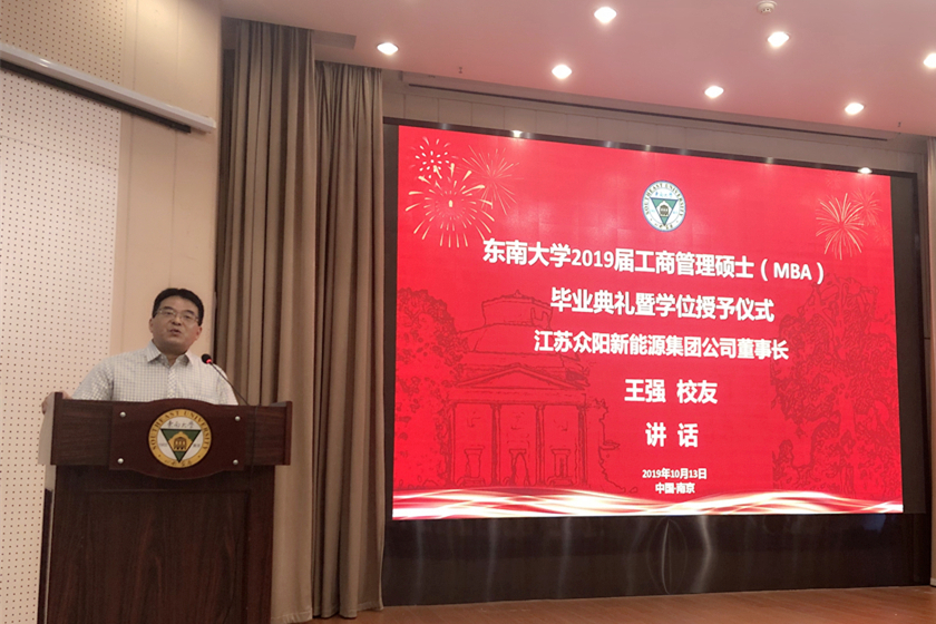 江苏众阳新能源集团公司王强董事长代表校友讲话。王强校友2004年MBA毕业,今天受邀重回母校,向学弟学妹们道贺!他说,止于至善,学习他人,完善自我,追求卓越,永远是东南大学校友们的努力目标。他说,当今时代,是一个寻找幸福的时代,是一个充满智慧的时代,我们要把学习当成一种生活方式。在他看来,校园教育就是用智慧和创新寻找自己的生活方式。他希望学弟学妹们在追求人生更高境界的征程中,始终不要忘记母校,常回家看看,为母校推进“双一流”建设进程,实现“1-10-100”东大梦做出自己的贡献。