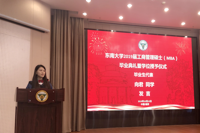 2019届优秀硕士毕业生向君同学代表MBA毕业生发言。她首先表达了对母校、老师们、同学们、亲属们的感激之情!回顾三年的学习生活,向君同学娓娓道来,如数家珍。她说:“三年的学习,使我们在职场上渐渐变得不可或缺,使我们在面对挑战时也更加从容。三年的校园时光悄然而过,但止于至善的精髓已深入人心,必将终身受用。她充满自豪又自信地说:今天,我们以东南大学为荣;明天,我们要让东南大学以我们为荣!”