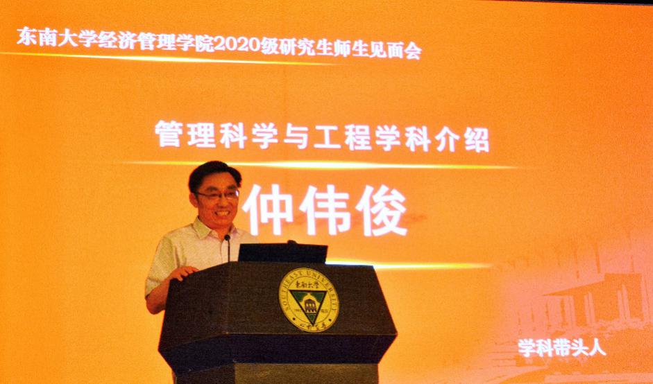 管理科学与工程学科仲伟俊教授为大家介绍了管理科学与工程的学科特点、学科发展历程、学科实力和人才培养情况,表示管理科学与工程学科有着优秀的师资力量,追求国际前沿的原创性的理论研究,本学科的老师们在国家层面和省市层面发挥重要的决策咨询作用。仲伟俊教授还对同学们提出了未来的希冀,希望同学们通过研究生阶段的学习不仅要学习知识,更要掌握先进的方法;不仅要提升学历,更要增强本领,特别在思想境界上和思想深度上有所提升。