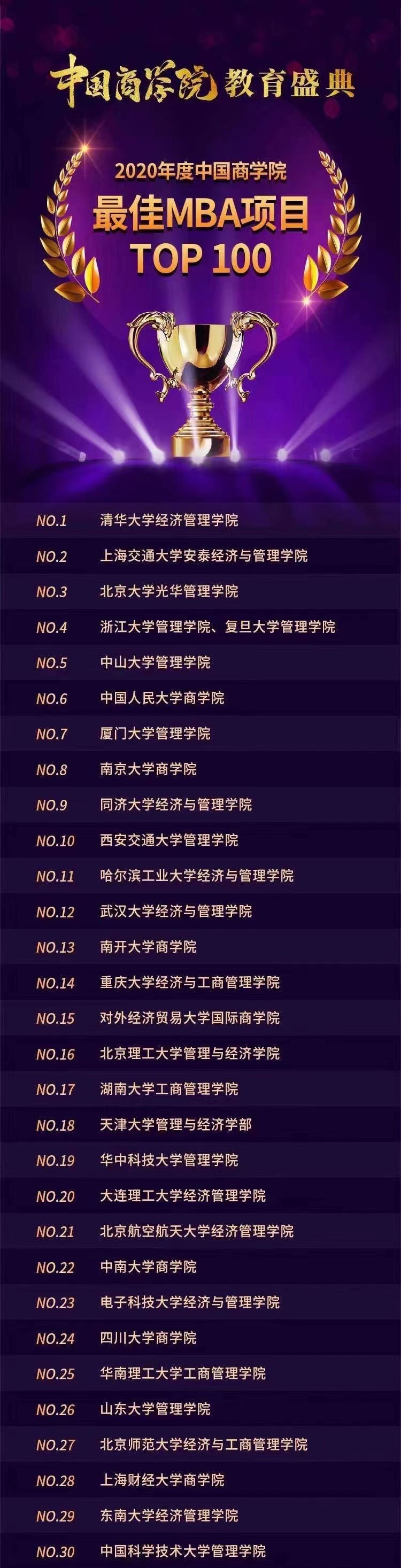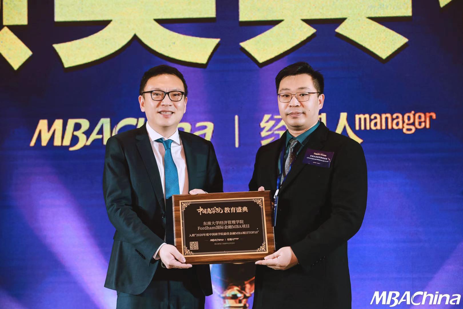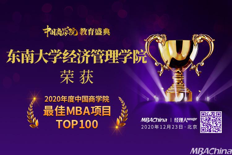 2020年12月23日,MBAChina与《经理人》杂志联合主办的2020年中国商学院教育盛典在京顺利召开。教育部高教司原司长、中国高教学会副会长张大良先生应邀出席盛典并致辞,湖南工商大学校长陈晓红院士发表了主旨演讲。作为本次年度盛典的重头戏,2020年度中国商学院“最佳MBA项目TOP100”排行榜闪耀发布。东南大学MBA项目入榜“2020年度中国商学院最佳MBA项目TOP100”第29名,另获得“2020年度中国商学院最佳金融MBA项目TOP10”和“2020年度中国商学院校友组织卓越领导奖”两项殊荣。