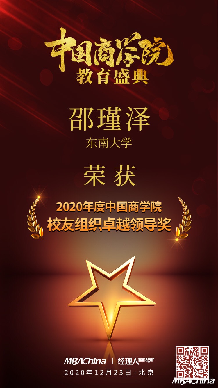 东南大学MBA校友邵瑾泽荣获“2020年度中国商学院校友组织卓越领导奖”。邵瑾泽为东南大学2018届MBA毕业生,曾任东南大学第十一届MBA联合会副主席,现任东南大学MBA创投俱乐部副会长,江苏高校创投俱乐部联席秘书长。就职南京纳才企业管理咨询有限公司总经理,在猎头顾问及人力资源管理等领域取得了突出成绩。邵瑾泽校友的获奖,是本次年度盛典对我校校友成就的一种肯定和鞭策。