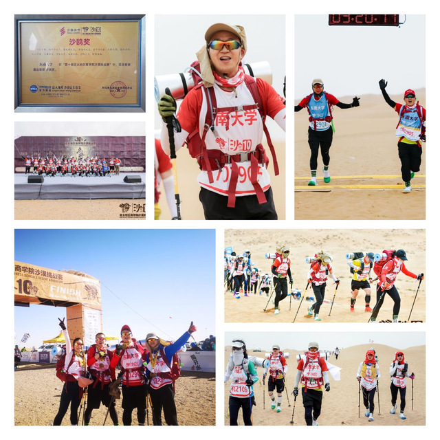 第十届亚太地区商学院沙漠挑战赛(以下简称“沙10”)于2021年5月1日至4日在内蒙古阿拉善盟腾格里沙漠举行,来自121所院校共3600多名选手在3天的时间里用脚丈量沙漠,完成70公里(超A100公里)的挑战。东南大学EMBA与MBA学员分别组队参赛,两支参赛队伍经受住了炎炎烈日、黄沙飞舞的大自然考验,以实际行动践行了“环保、协作、坚持、责任”的赛事理念,以不畏艰难、挑战自我的拚搏精神,再次取得了优异的成绩,成为众人瞩目的“双沙鸥”团队。