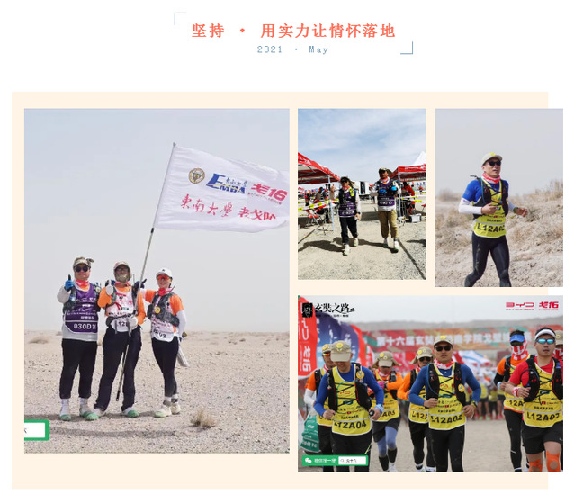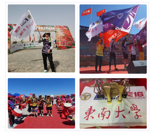 东南大学戈16战队共分为院校EMBA队、东南大学老戈队以及A+队3支队伍,共计42名队员参赛。本次赛事,东南大学EMBA队成绩排位第32名,老戈队获得第6名的优异成绩,东南大学再次捧回沙克尔顿奖、奋进奖奖杯,首次获得传承超越奖。东南大学戈16队员“以爱之名,再战戈壁”,用实力传承“理想、行动、坚持、超越”的戈赛精神。