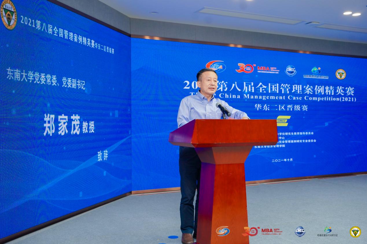 东南大学党委常委、党委副书记郑家茂教授致辞。郑书记代表东南大学对大赛组委会的信任和支持表示衷心的感谢,对出席本次大赛的各位嘉宾、专家评委、各参赛队伍的MBA师生们表示热烈的欢迎。他说,东南大学正奋进在创建中国特色的世界一流大学的征程上,学校的快速发展推动了MBA的创新探索之路。郑书记强调,MBA案例大赛是解决专业学位研究生实践创新能力的有效途径,对此,郑书记从专业学位研究生培养的高度,就MBA案例赛,提出了打好擂台、站好舞台、用好平台的三点要求,这对MBA案例教学和MBA培养具有重要的指导意义。