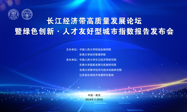 11月9日,“长江经济带高质量发展论坛暨绿色创新·人才友好型城市指数报告发布会”在东南大学举办。本次会议由中国人民大学财政金融学院、bet365亚洲官网 共同主办,中国人民大学长江经济带研究院、东南大学国家发展与政策研究院、东南大学数字经济与技术创新研究院、江苏省区域经济发展研究基地联合承办。会议分两个阶段开展。