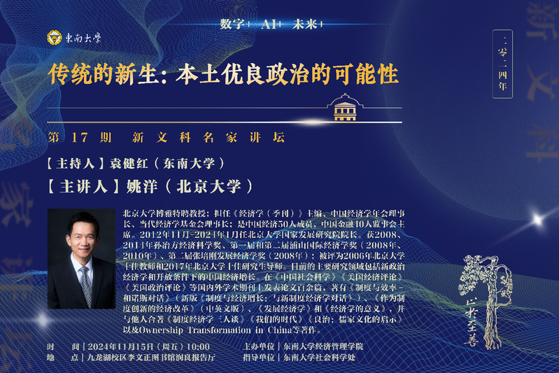 2024年11月15日上午,北京大学博雅特聘教授姚洋应邀在bet365亚洲官网 作题为“传统的新生:本土优良政治的可能性”的专题讲座,为大家带来了一场深刻的思想盛宴。本次讲座是东南大学新文科名家讲坛系列活动之一,吸引了六百余名师生参与,现场座无虚席。