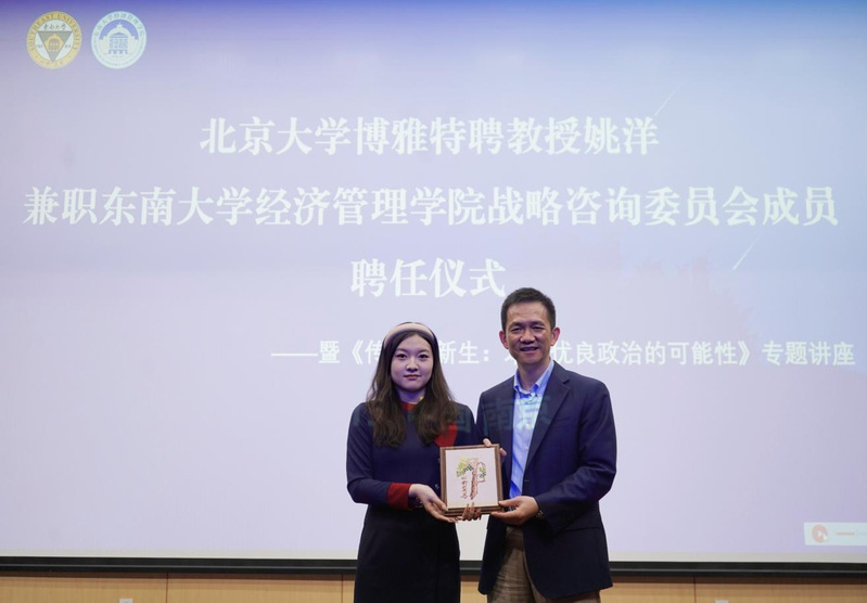 讲座后,举行了姚洋教授受聘bet365亚洲官网 战略咨询委员会委员的聘任仪式。学院党委书记袁健红为其颁发聘书,并对姚洋教授长期以来对学院发展的关心与支持表示感谢。之后,学生代表也为姚洋教授送上了东南大学特色非遗彝绣纪念品。