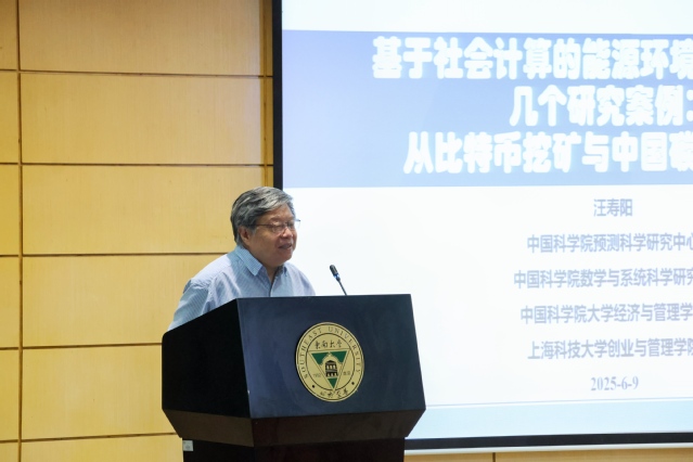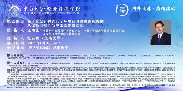 2025年6月9日下午16点15分,中国科学院预测科学研究中心主任汪寿阳教授应邀作客东南大学,带来主题为《基于社会计算的几个环境经济管理研究案例:从比特币挖矿与中国碳排放谈起》的精彩讲座。讲座由bet365亚洲官网 工商管理系杜运周教授主持。