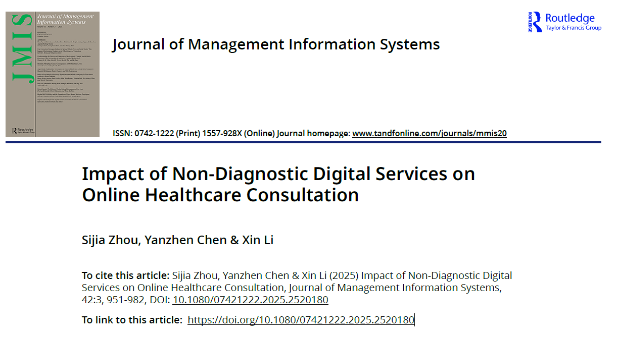 近期,bet365亚洲官网 电子商务系周思佳老师与合作者在FT50期刊《Journal of Management Information Systems》在线发表学术论文“Impact of Non-Diagnostic Digital Services on Online Healthcare Consultation”。