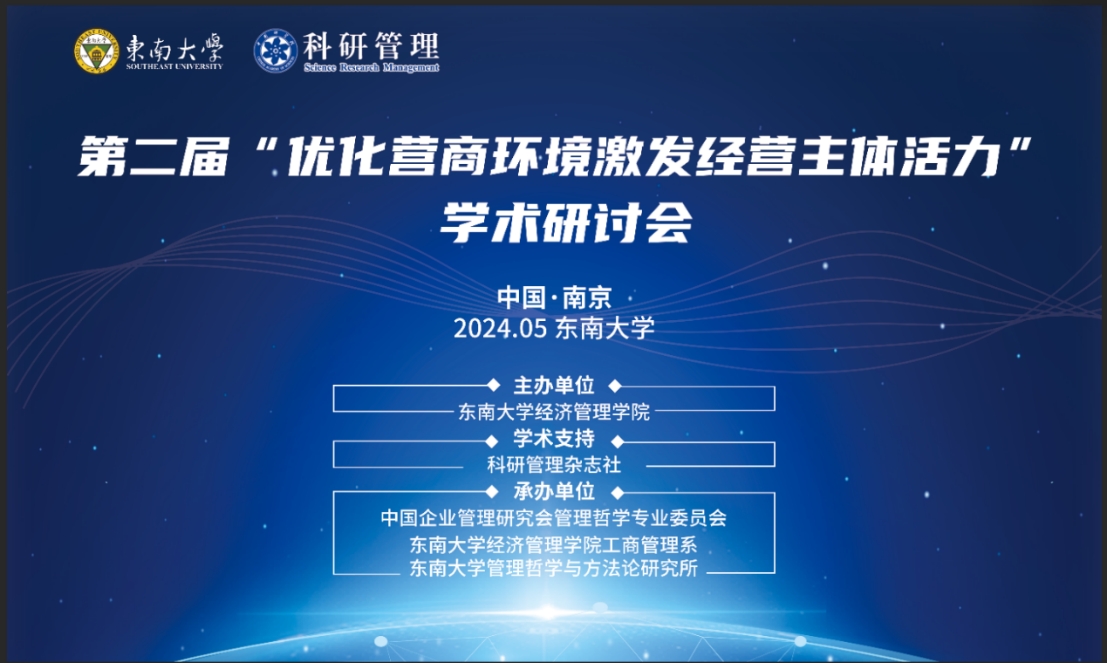 On May 18-19, 2024, the second academic symposium on "Optimizing the Business Environment to Stimulate Market Entities' Vitality" was successfully held at the Jiulonghu Campus of Southeast University, Nanjing. Academically supported by Science Research Management journal and hosted by the School of Economics and Management, the event was co-organized by the Management Philosophy Professional Committee of the Chinese institute of Business Administration, the Department of Business Administration, and the Institute of Management Philosophy and Methodology of Southeast University. The symposium gathered experts, scholars, and graduate students from various esteemed institutions, including the Development Research Center of the State Council, Jiangsu Provincial Committee of the Chinese People's Political Consultative Conference, Science Research Management journal, and renowned universities such as Ocean University of China, University of Chinese Academy of Sciences, Renmin University of China, China Agricultural University, Sun Yat-sen University, Zhejiang University, Xiamen University, Nanjing University, Fudan University, Wuhan University, University of Electronic Science and Technology of China, Northwestern Polytechnical University, Central South University, Northeastern University, Beihang University, Dalian University of Technology, Central University of Finance and Economics, Dongbei University of Finance and Economics, Zhejiang Gongshang University, Hohai University, Nanjing University of Aeronautics and Astronautics, Nanjing Normal University, Nanjing University of Science and Technology, Nanjing University of Finance and Economics, Nanjing University of Posts and Telecommunications, Henan University of Economics and Law, Anhui University of Finance and Economics, Hunan University of Commerce, Inner Mongolia University of Finance and Economics, Yunnan University of Finance and Economics, Shanxi University of Finance and Economics, and Southeast University.